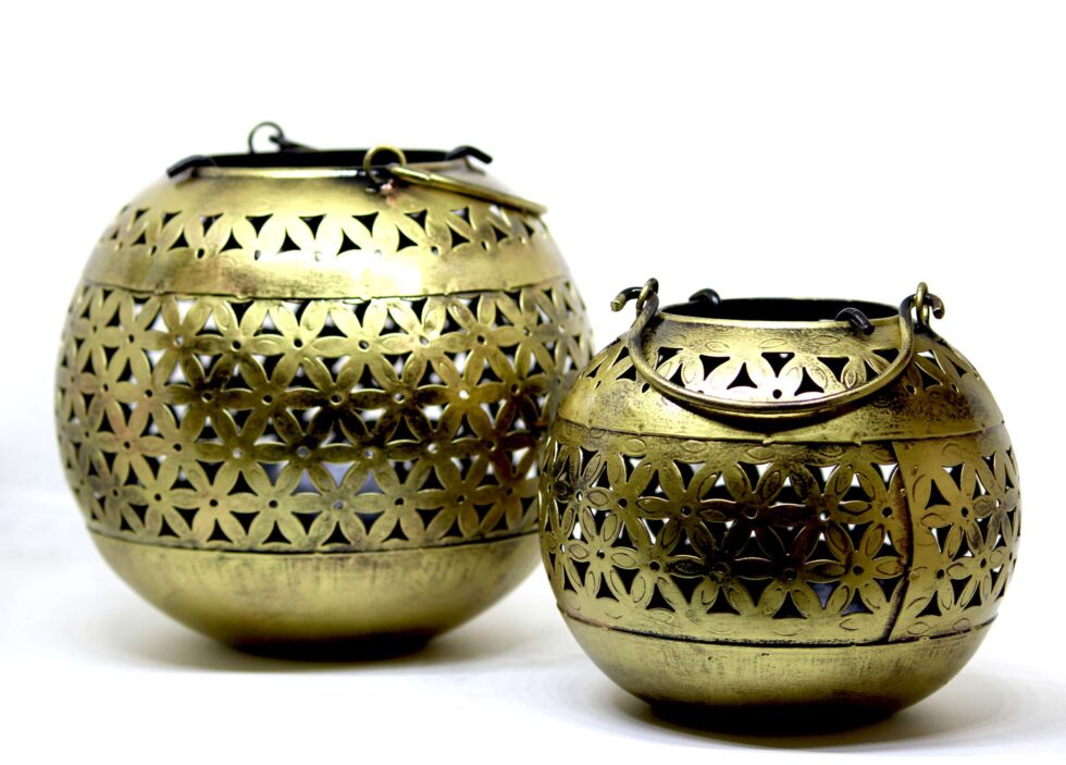 The image depicts two decorative brass bowls with handles, sitting on a table. The bowls have a floral design etched on their surface.